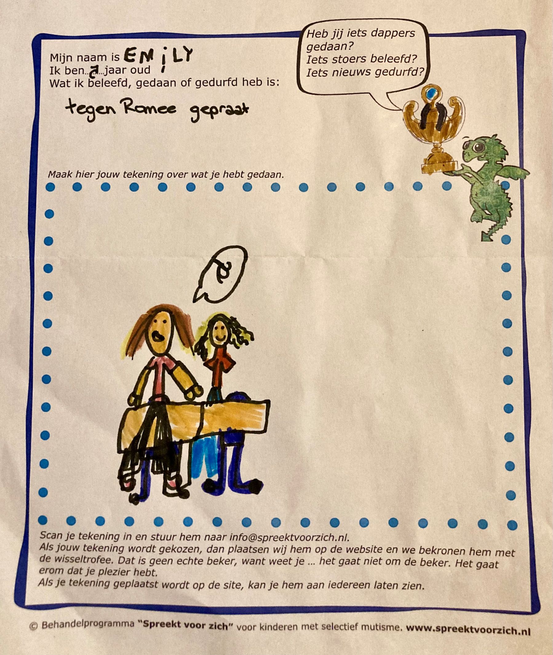 En ze durfde ook nog te vertellen hoeveel punten ze gehaald had. Myrthe durft ook al te hakken en plakken en “ja”, “nee” of “ik weet het niet” te zeggen bij een kaartspelletje met haar juf. Zo knap! En ze wil graag nog veel meer zeggen tegen juf. Dat gaat je vast lukken Myrthe, als je al zo dapper bent. Dank je wel voor je mooie tekening!